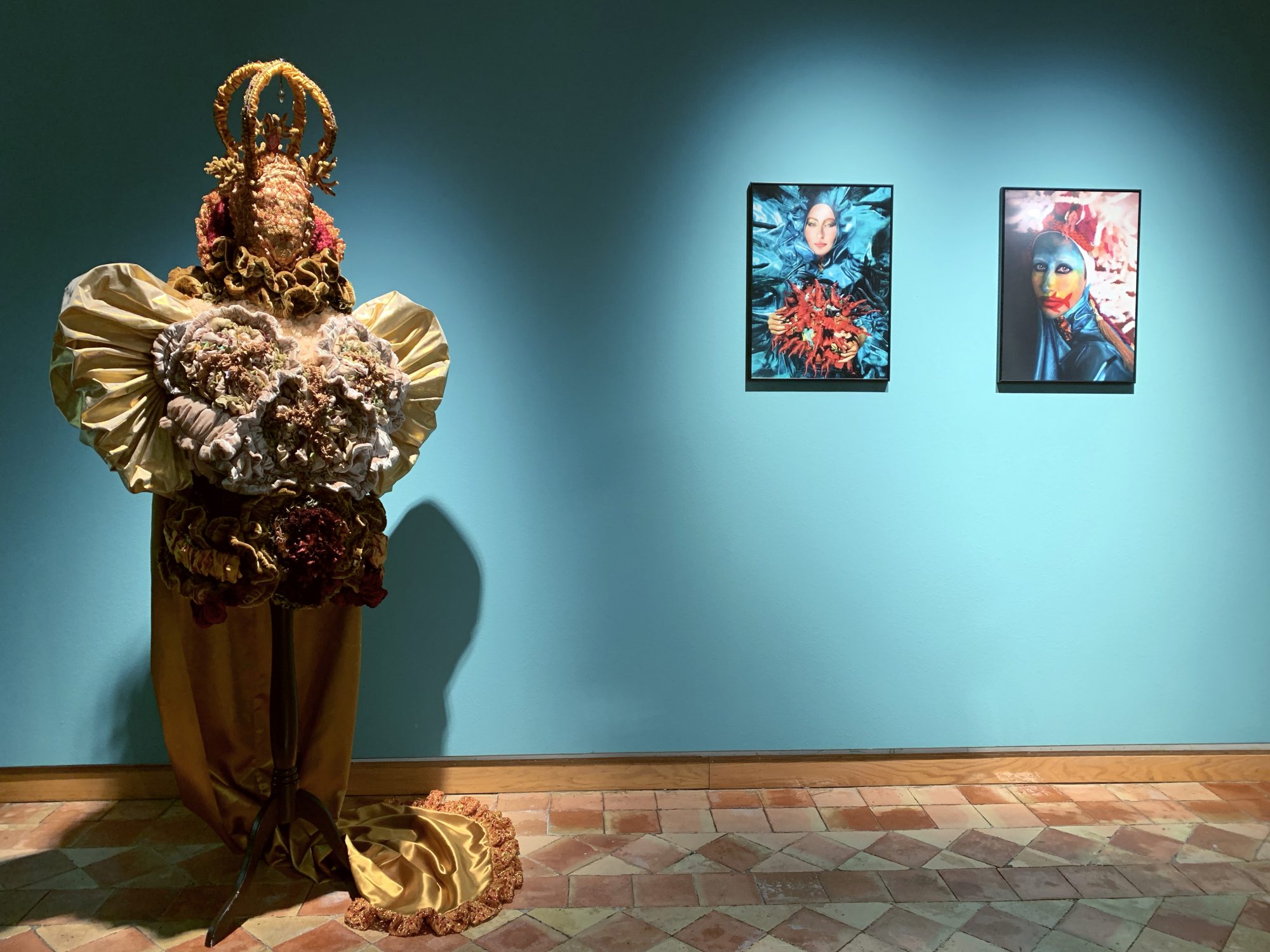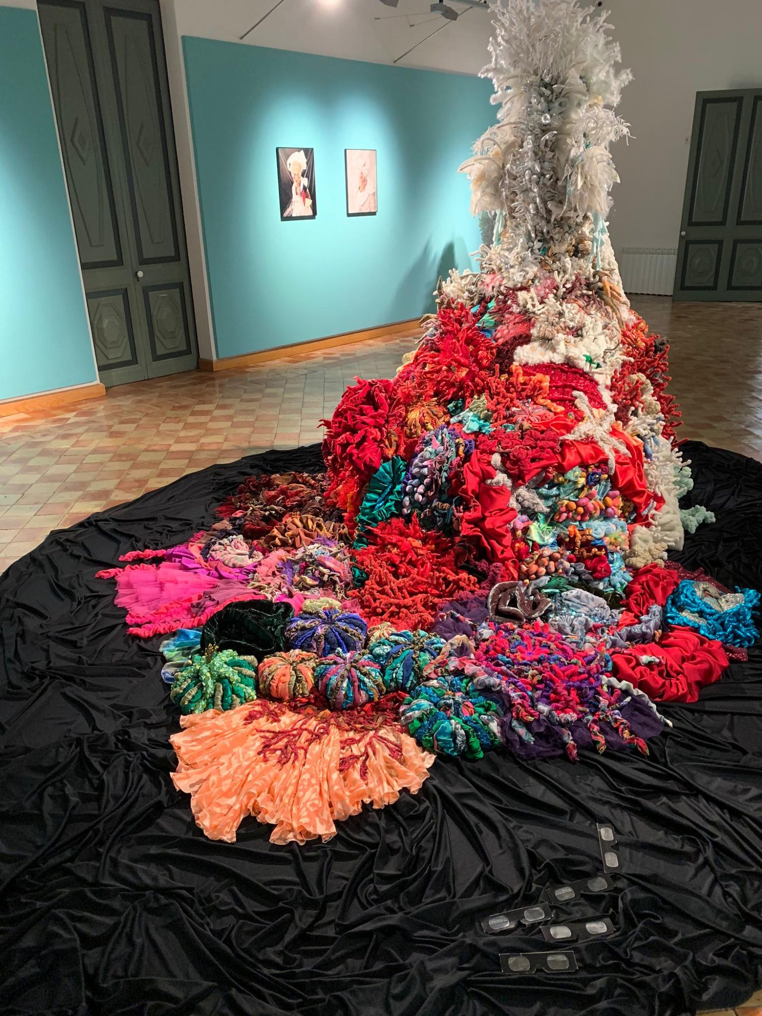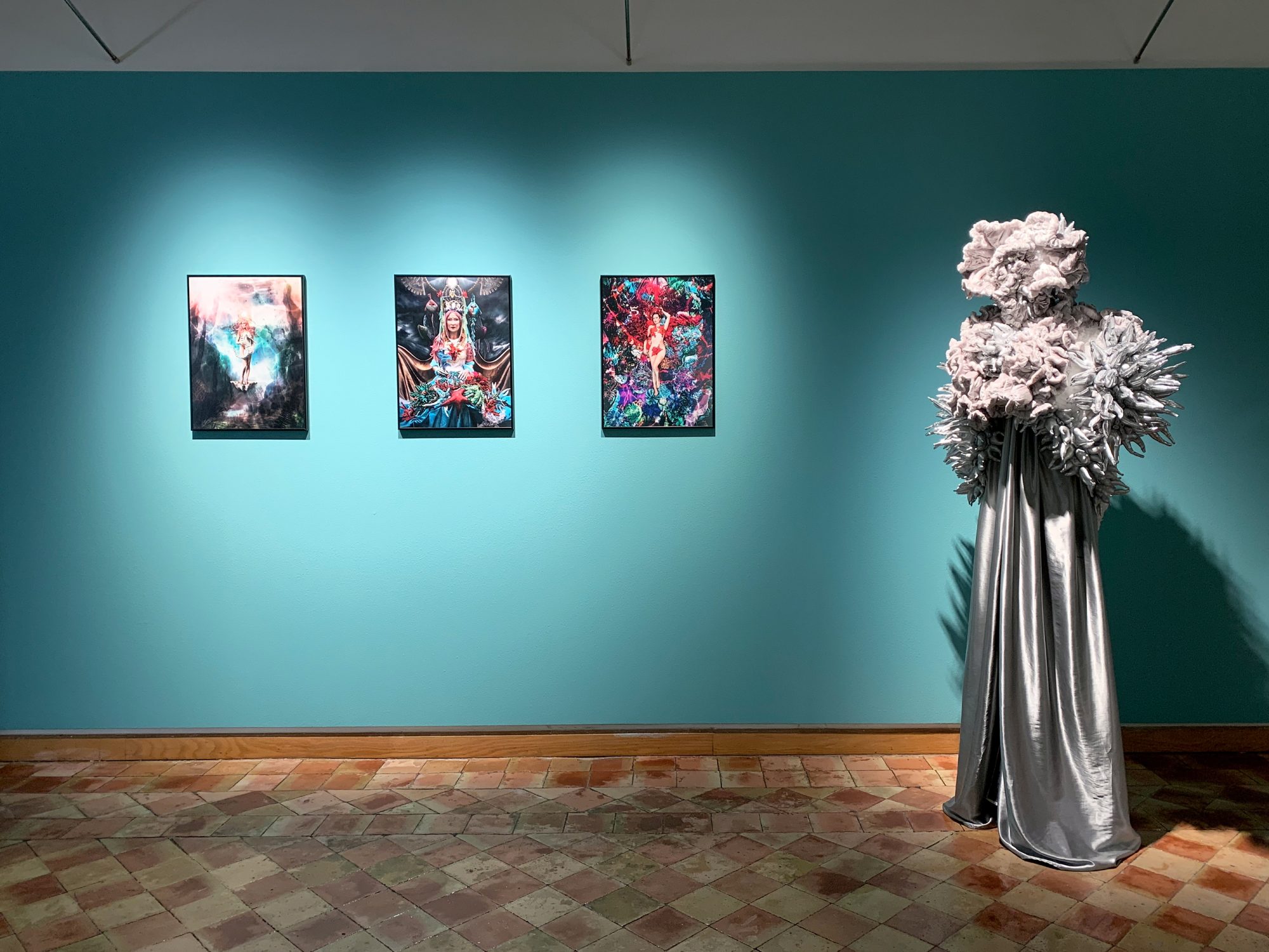 In Breathing Waves, Paola Idrontino – a.k.a. “Papayapie”– shows her fascination produced by the sea. At the same time, the artist tries to understand the strange way in which humans relate to this extremely powerful entity on our planet, which breathes life, and that literature has described as a metaphor of life. British author Philip Hoare reminds us: “The sea, like the imagination of the writer or the artist, carries all kinds of obsessions, stories and ambitions.” Paola Idrontino’s photographs and textile sculptures also express affection for tales and myths, with references to a feminine world that professes to be the protective deity of underwater creatures. To honour the physical dimension of the oceans, the artist chooses to represent its beauty – exuberant and chromatic – assuming it as a metaphysical context that defines and connects us. However, the majestic anthropomorphic creations sewn by Idrontino’s hand, also magnify with their preciousness the other side of the mask and what is hidden under the disguise: a condition of fragility and climatic urgency – like the whitening of coral reefs – that instigates the participation, interpretation and awareness of the viewer. Submerging oneself in art has a lot to do with submerging oneself, without knowing what will happen when you delve into its waters, and facing Paola Idrontino’s work we penetrate an extraordinary abyss, simultaneously perceptible and hidden, that sensitizes us with each wave. (by Laura Cornejo Brugués, exhibition curator)