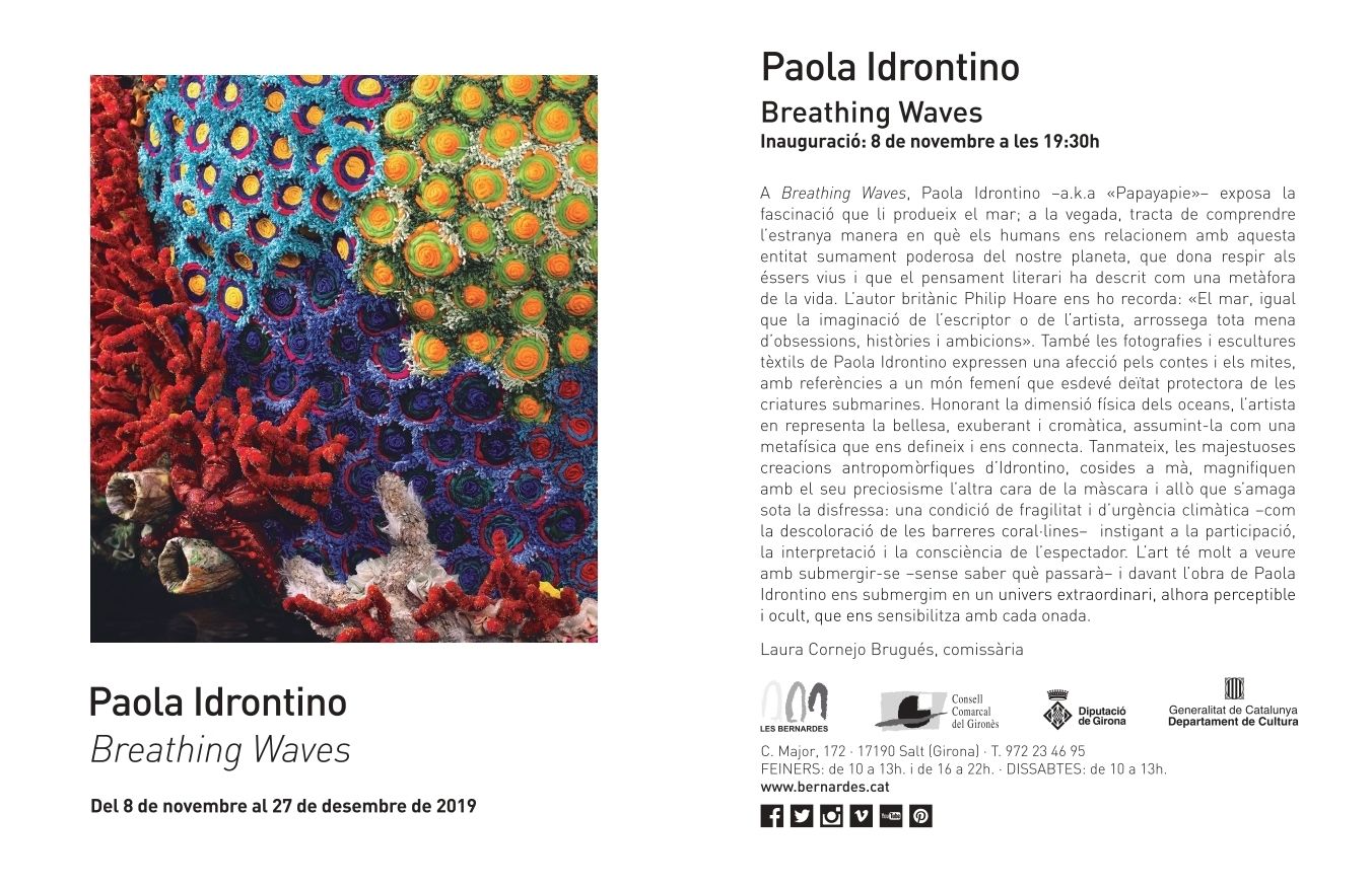 Breathing Waves was Paola Idrontino’s first solo show curated by Laura Cornejo. It showcases textile sculptures and photographic work related to the beauty of our world’s oceans and the devastating effects of climate change on coral reefs. The show was open to the public from Nov 8th to Dec 27th 2019, at Les Bernardes Art Exhibition Centre, Girona (Catalonia, Spain)